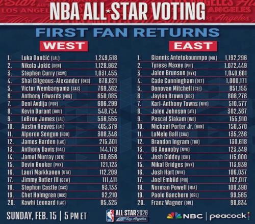 东契奇124.9万票领跑全联盟,字母哥第二119.2万,库里西部第三,詹姆斯西部第九。
